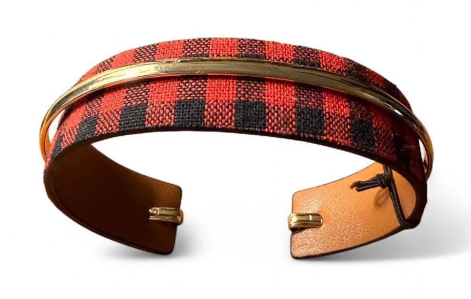 Story by DaVinci Black and Red Gingham Check Bracelet with Gold Metal Detail New with Tag The bracelet is a wide, cuff-style accessory featuring a black and red checkered or gingham pattern. It is made of fabric, on top is a thin, smooth, gold-toned bangle bracelet. This creates a layered look with a mix of bold pattern and sleek metal texture. #cottagecore #plaidaccessories