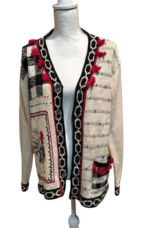 Storybook Knits cardigan sweater size small Cream, black, and red with rooster on the side and tassels on the pocket Sweater is missing a clear button and a black one on the second to last button spot
