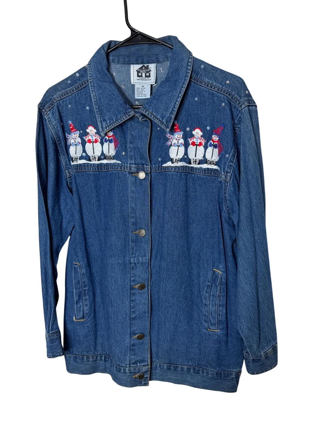 A charming blue denim jacket adorned with cheerful embroidered snowmen and sparkling rhinestone acce... Show more