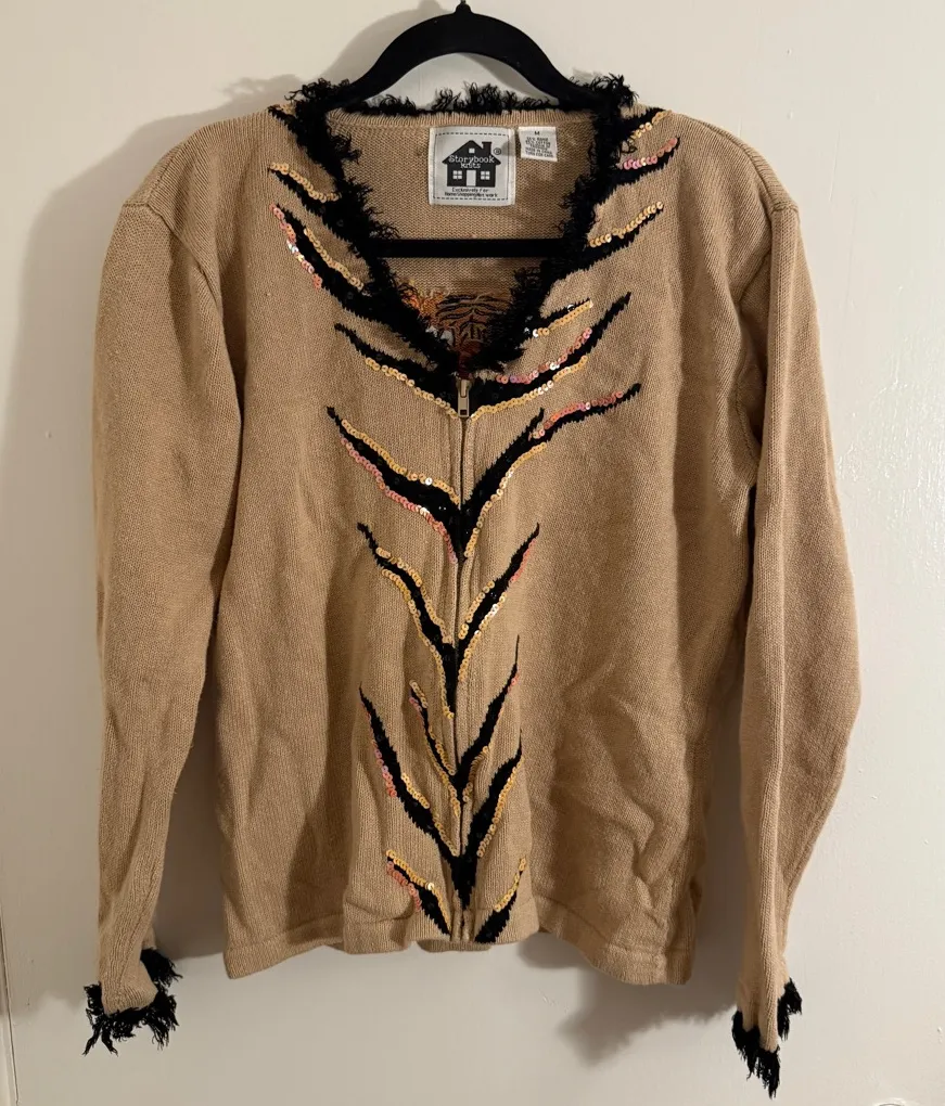 Charming tan cardigan with unique black and gold embellishments. Ideal for a stylish touch. Beautiful full zip womens medium sweater with sequins and tiger embroidered print on back. Measures 22" under arm across chest and 23" long. Excellent preowned condition.