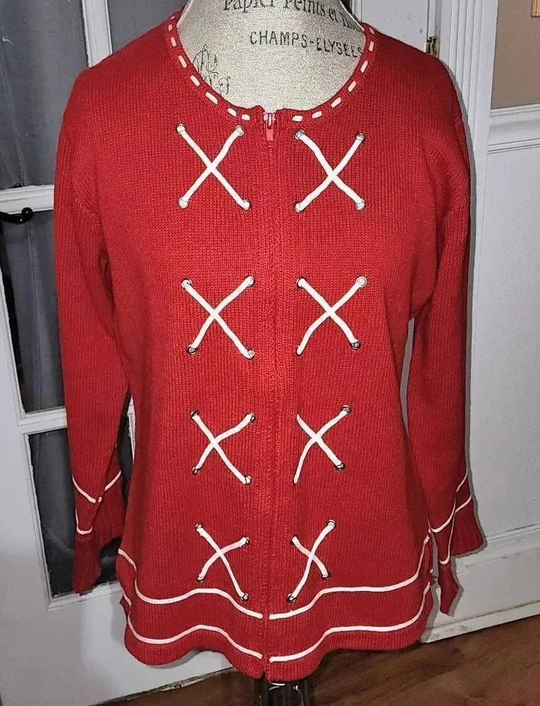 Storybook Knits Womens Red White‎ Nantucket Shore Full Zip Cardigan Sweater Med Red - $34 - From Pamela