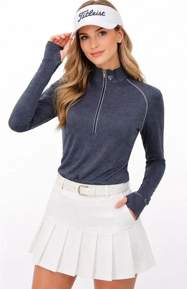 Straight Down long sleeve quarter zip golf top designed for women. Features a subtle heathered blue fabric with contrasting white stitching detail along the seams and a small heart logo at the zipper pull. Thumbholes at the cuffs add a practical touch for active wear. Perfect for a day on the golf course, a casual outing, or a brisk walk. Measurements: • Chest: 17 in • Sleeve Length: 25 in • Length: 24 in Keywords: golf shirt, athletic wear, quarter zip, long sleeve, performance top, activewear, athleisure, sporty, outdoor activity, lightweight, moisture wicking, stretch fabric, breathable *All Items have been cleaned/ steamed.