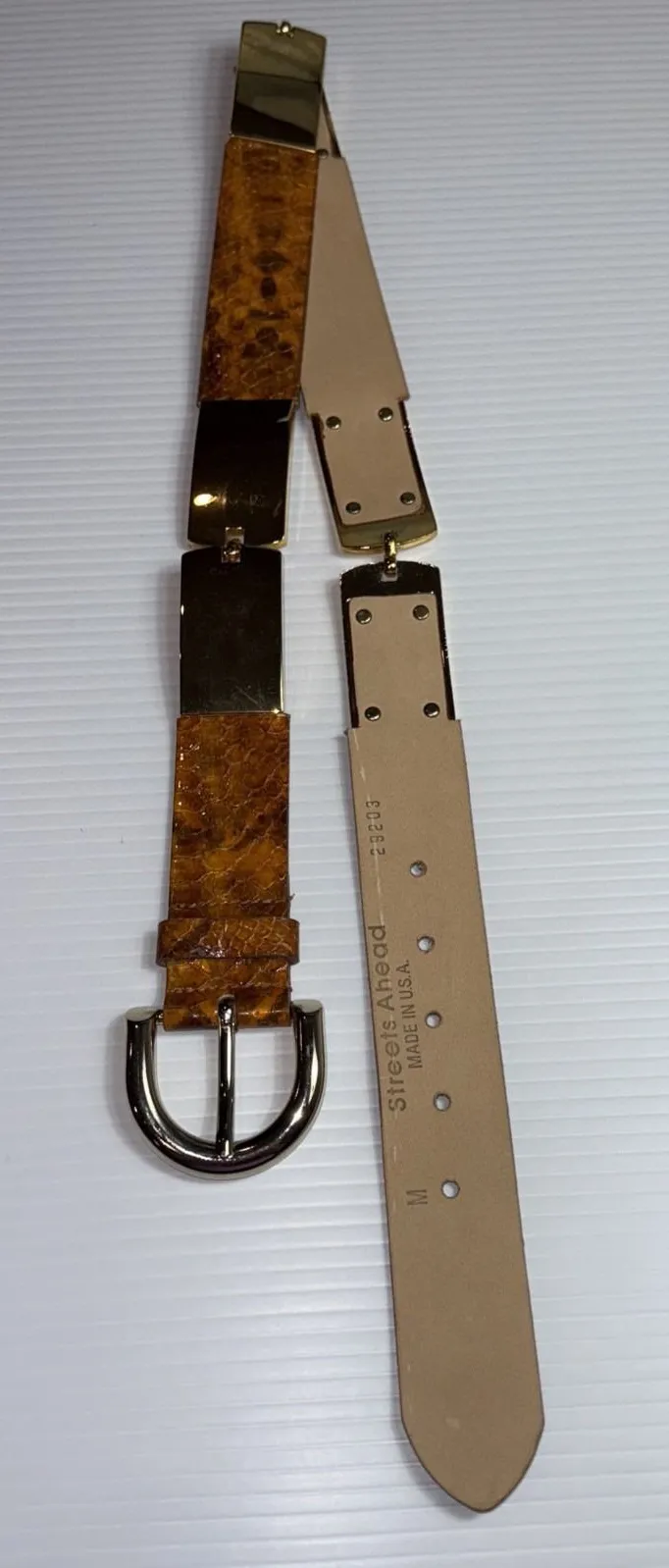 The Streets Ahead Belt in orange and gold snakeskin print is a stylish accessory for women. Made in the USA with Italian craftsmanship, this adjustable belt features a unique animal print pattern and a metallic theme. The leather material and normal width add a touch of luxury to any outfit, while the buckle accent adds a trendy finishing touch. This belt from Streets Ahead is perfect for adding a pop of color and personality to your wardrobe.
