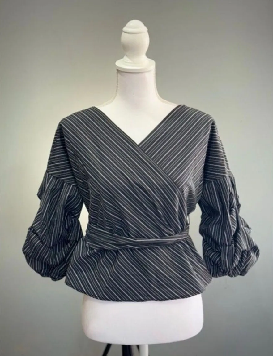 BRAND: Streetwear Society SIZE: S Junior’s CONDITION: NWT COLOR: Black/White MEASUREMENTS: 19.5” pit to pit, 19.5” shoulder to hem, 13.75” sleeve inseam MATERIALS: 55% cotton, 45% polyester CARE: Machine wash cold NOTES: Full Wrap front, Belted, puffy gathered sleeves Deadstock item