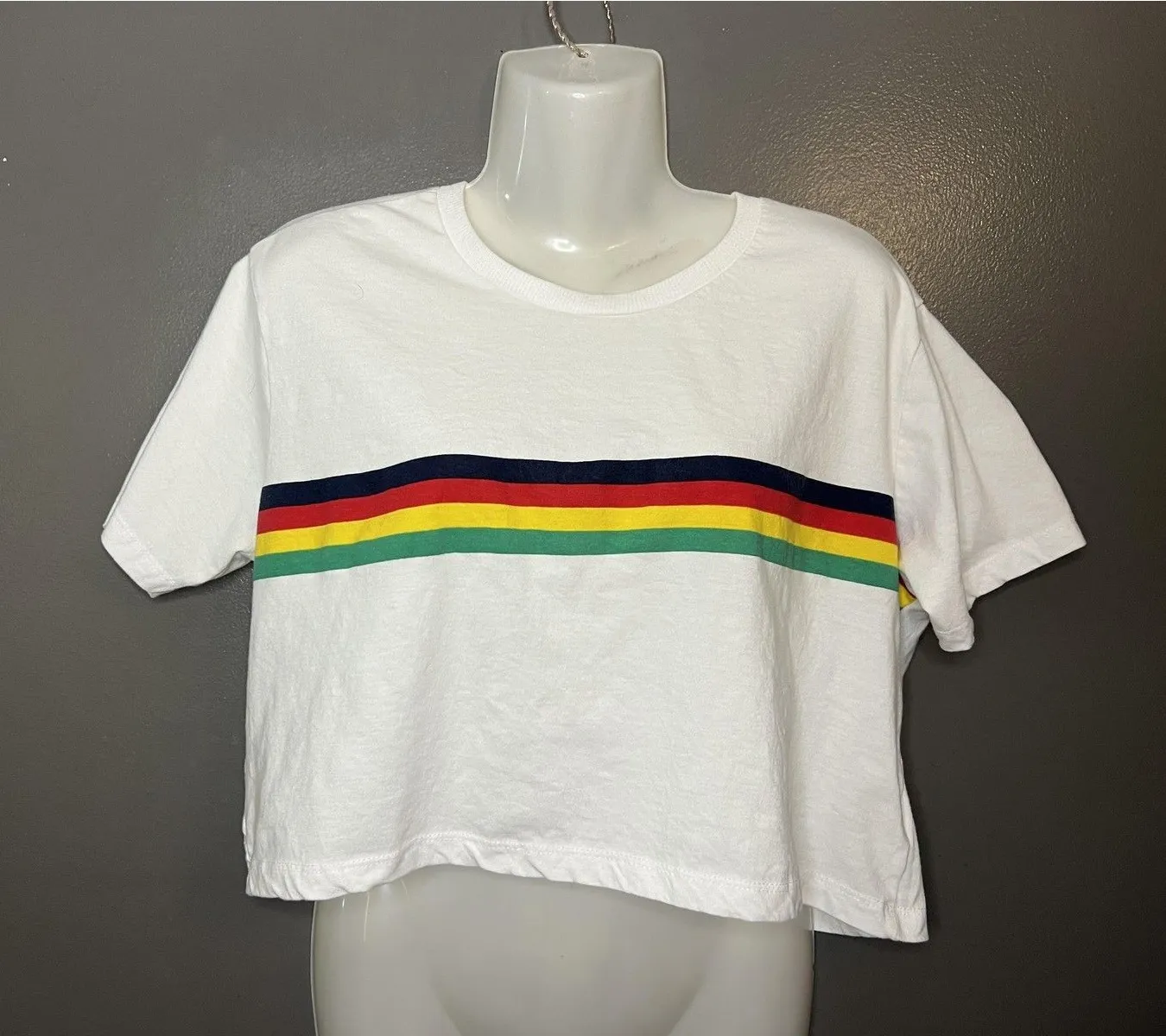 Gently worn with fabric clean and colors vibrant. No stains, holes, or cracking on print. Original retail tags removed. Brand: Streetwear Society Type: Cropped T-shirt with crew neck and short sleeves. Color: White with horizontal navy, red, yellow, and green rainbow stripe across the chest and solid white back. Size on tag: M Materials: 60% cotton, 40% polyester soft knit fabric. Style/Model code: Style # 00-2566B; made in Bangladesh. Details: Cropped length, straight hem, ribbed neckline, colorful striped graphic design for casual everyday wear. PTP 21" Length 18" bin 91 2481