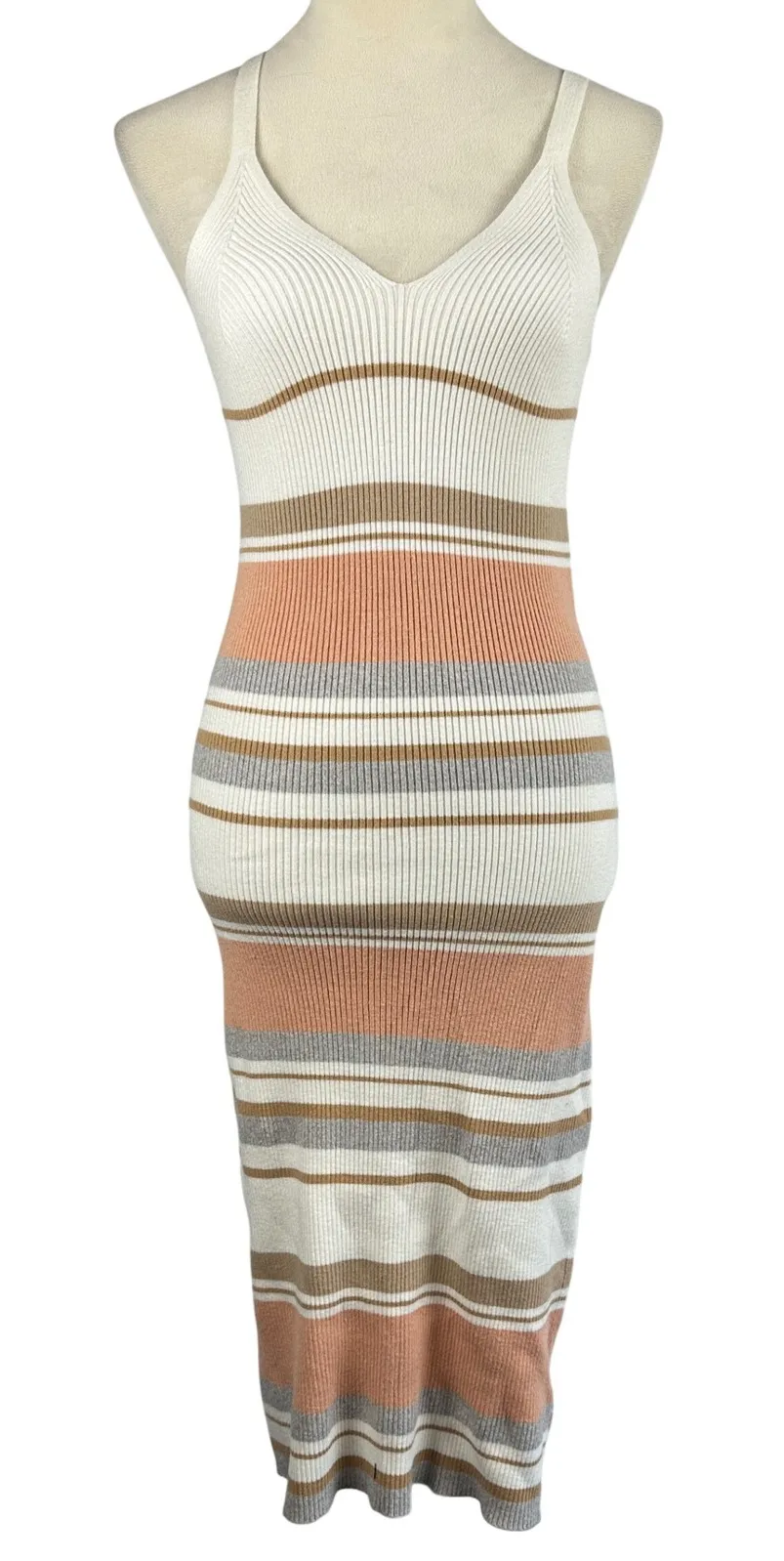 Embrace effortless chic with this stunning Willow & Wind midi dress, designed to flatter your silhouette. The vibrant striped pattern, featuring warm earthy tones and a playful coral hue, dances across a fine ribbed knit fabric that feels incredibly soft against your skin. Delicate spaghetti straps lead to a flattering V-neckline, while the bodycon fit gently hugs your curves, creating a sophisticated and alluring look. This versatile piece is perfect for a sunny brunch with friends, a stylish evening out, or even a casual beach getaway. Gently used. Keywords: Willow & Wind dress, striped midi dress, ribbed knit dress, bodycon dress, spaghetti strap dress, v neck dress, women's fashion, summer dress, casual dress, evening dress, knit dress, colorblock dress, sophisticated dress