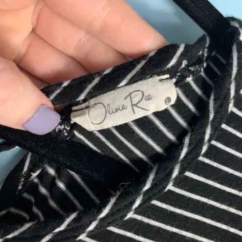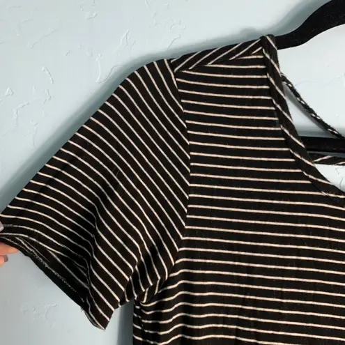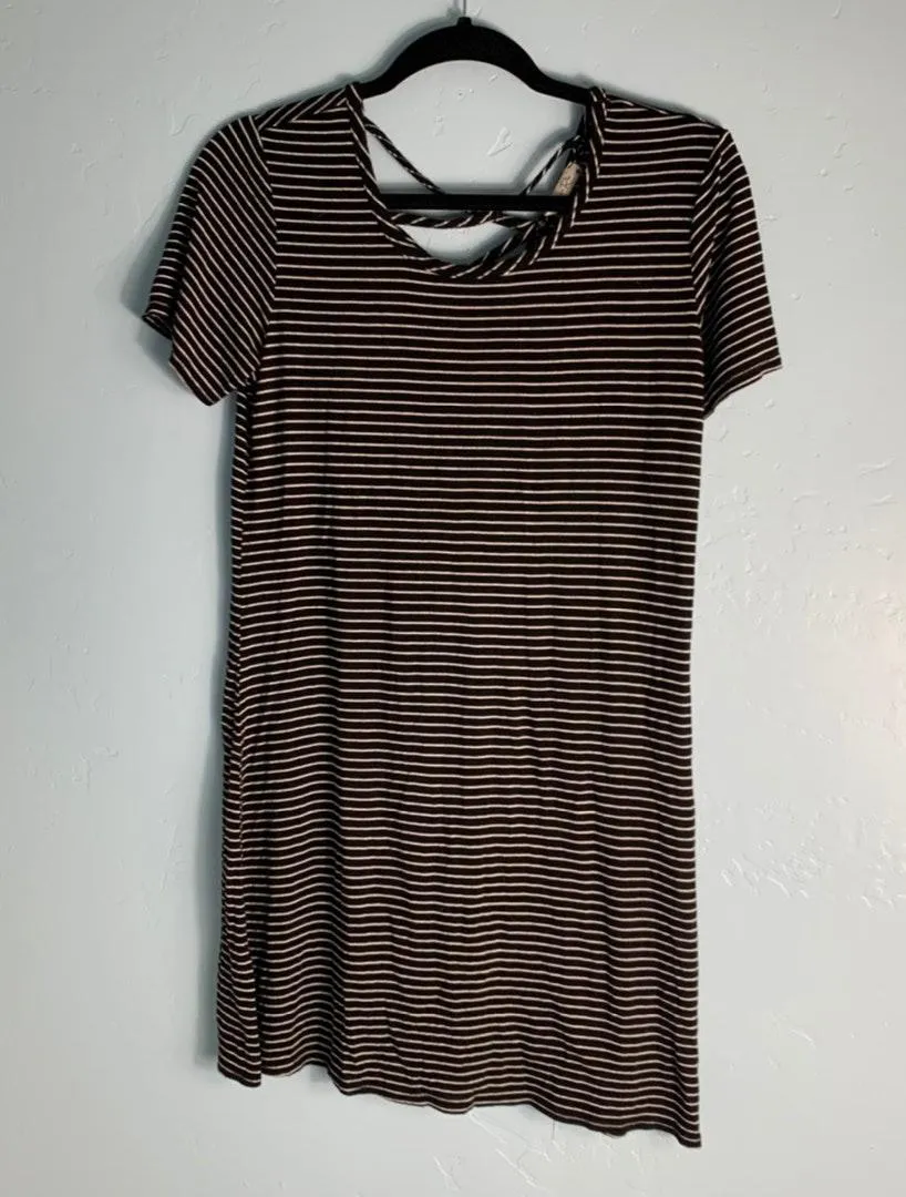 black and white striped shortsleeve t-shirt dress 98% rayon, 2% spandex size Large, pit to pit: 16 inches, from right shoulder to bottom: about 31 inches long cute cut out with design on the back perfect for spring and summer coming up, very flowy and cute