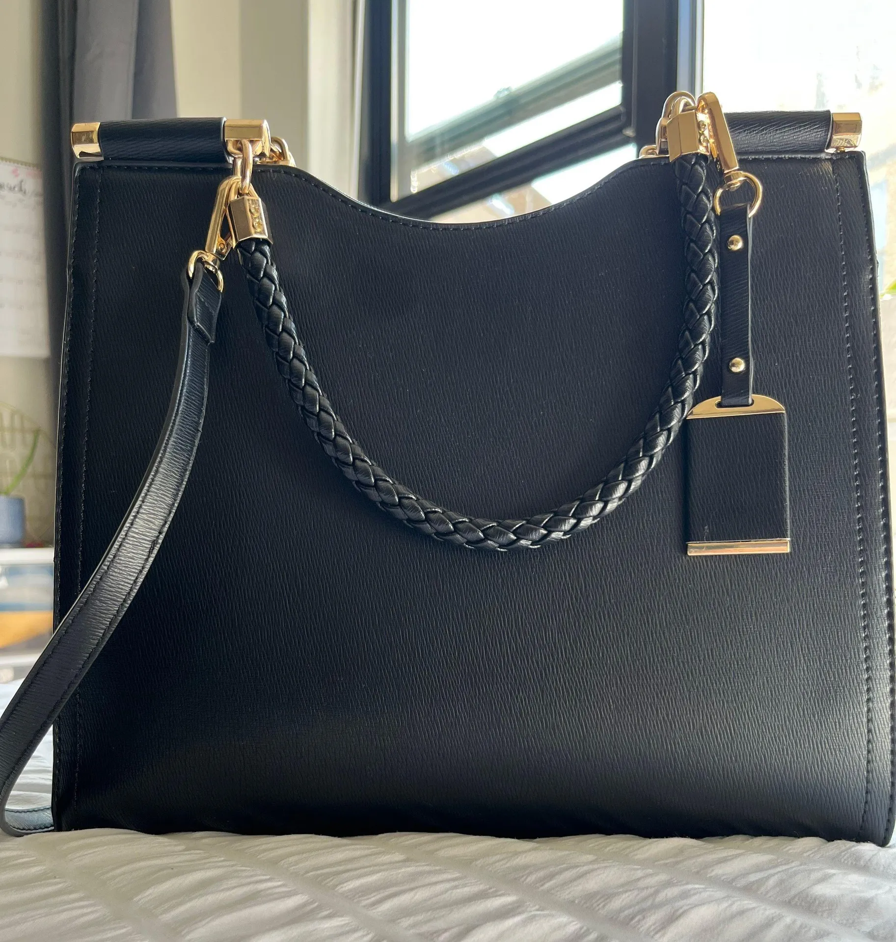 Barely used structured black bag/purse. Gold details have a bit of wear (shown in last photo of one of the details, it is similar on each detail but not very noticeable). It is in near perfect condition. Pretty large for a purse - can fit a smaller laptop. Photo shows with a MacBook Pro that has a cover on it, but wouldn’t fit anything wider than that due to zipper constraint. Has braided handles and a detachable longer strap for cross body wear.