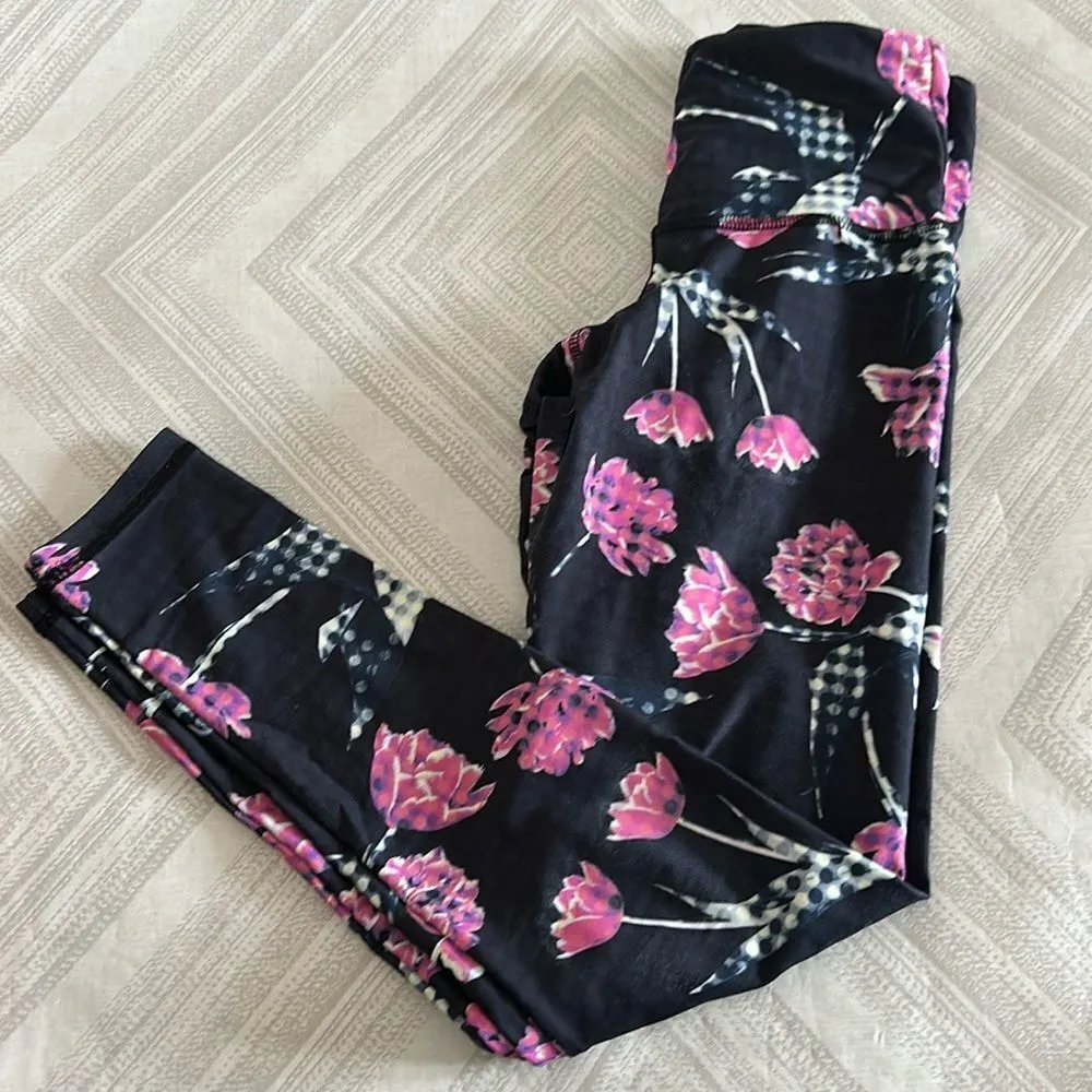 Strut This Women’s Navy Blue With Pink Floral Printed High Waist Leggings. Gently worn. The white faded areas are part of the pattern. One size. Measures 25.5” inseam. 11.5” front of waist.