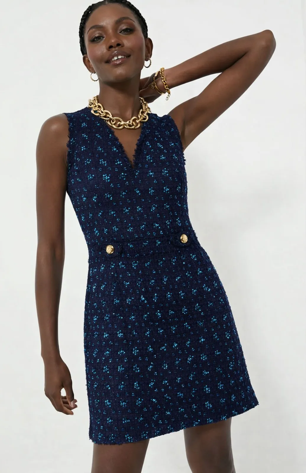Brand new with tags! This stunning Sail to Sable tweed dress is both classic and modern, featuring a sleeveless cut and a flattering silhouette. Crafted from textured navy tweed with a vibrant teal mini floral motif, it includes a soft frayed v-neckline, subtle waist detailing, and decorative gold-tone buttons at the waist. Shoulder to shoulder: 16.5” Bust: 17” Waist: 17” Hips: 19” Length: