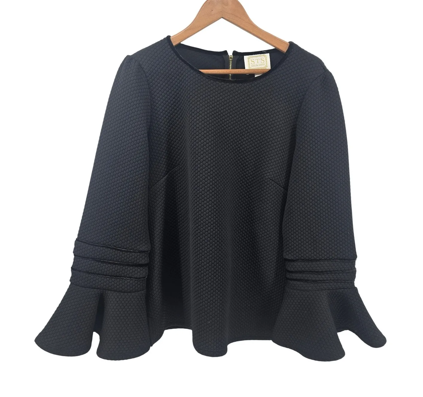 Measurements: • Chest: 19 in • Length: 25 in • Sleeve Length: 23 in Type: Blouse Department: Women Material: Polyester, Spandex, Viscose, Nylon Neckline: Round Neck Sleeve Length: Long Sleeve Sleeve Type: Bell Sleeve Pattern: Geometric Accents: Zipper, Pleated, Quilted Features: All Seasons Fit: Classic Fabric Type: Knit Occasion: Casual, Party/Cocktail Closure: Zip Keywords: quilted, textured, bell sleeve, ruffle sleeve, zipper, black top, statement sleeve, elegant, business casual, chic, fall fashion, winter style, velvet trim Smoke free, cat friendly home Fast shipping 1-2 business days Thanks so much!