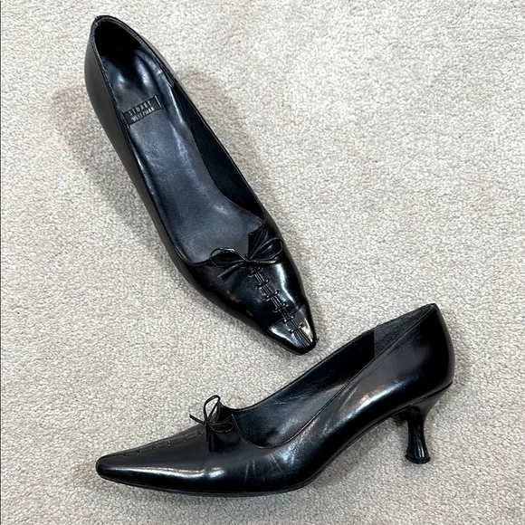 Stuart Weitzman Black Leather Kitten Heel Bow Vintage Office Siren Coquette Pointed Toe Women 8.5B... Show more