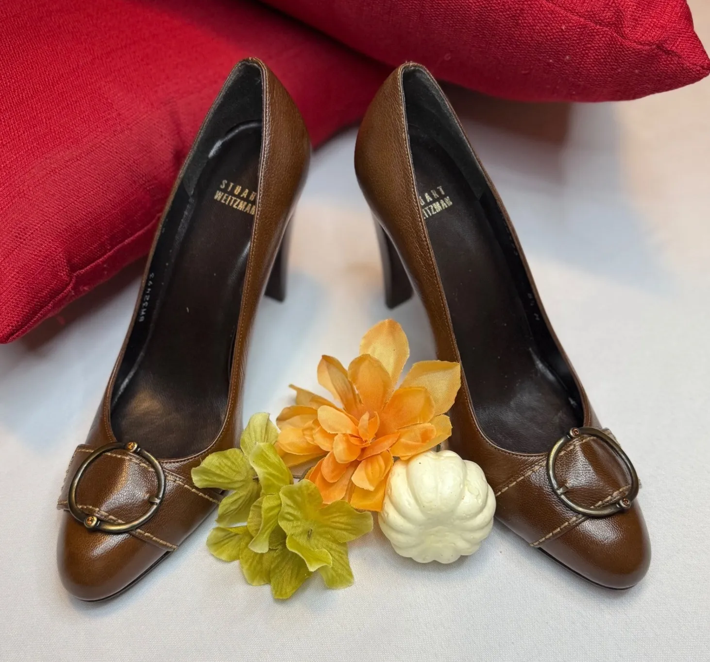 Elevate your look with these sophisticated Stuart Weitzman brown leather pumps. The rich brown hue o... Show more