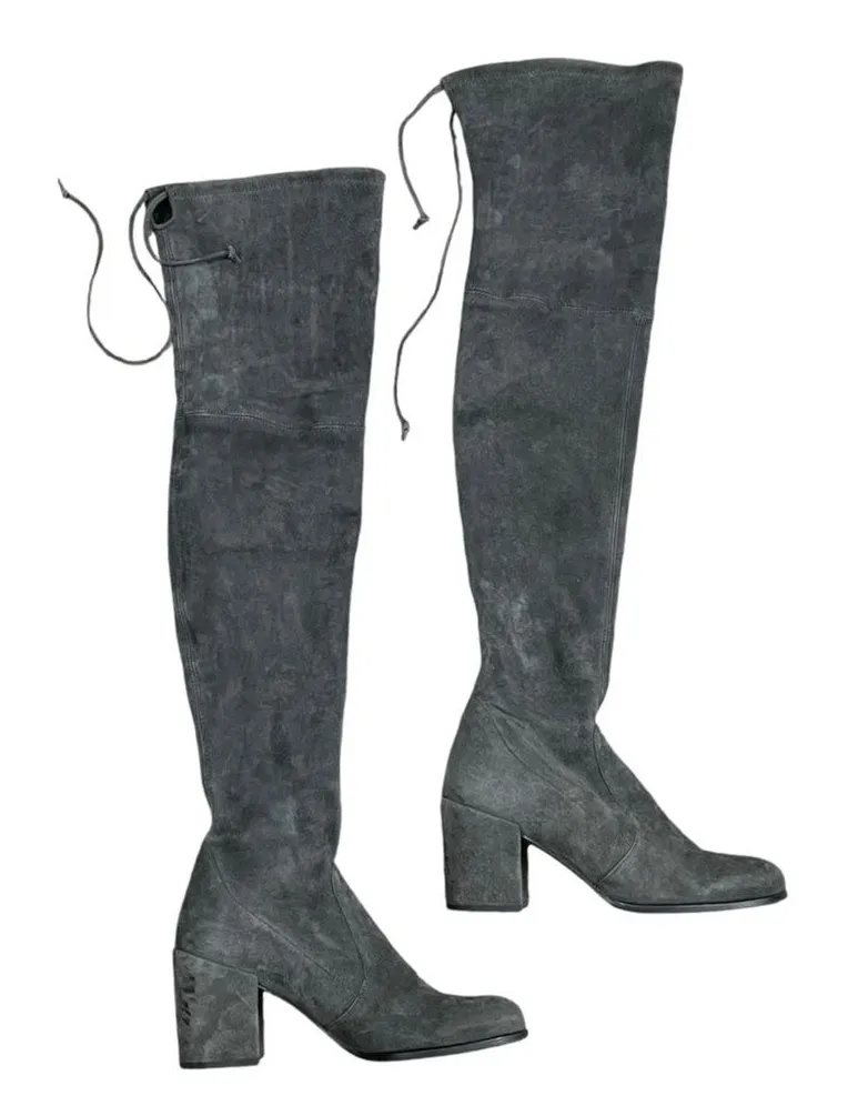 Stuart Weitzman Slate Gray Suede Over-the-Knee Boots Sz 7 Almond Toe Block Heel in good condition wi... Show more