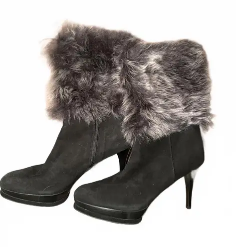 Elegant women's heeled boots by Stuart Weitzman. Features a stylish faux fur cuff for added warmth a... Show more