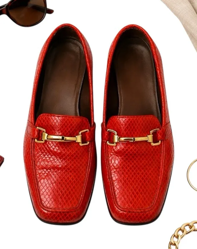 Stuart Weitzman red snake-print leather bit loafers with square toe and gold-tone hardware. Bold sta... Show more