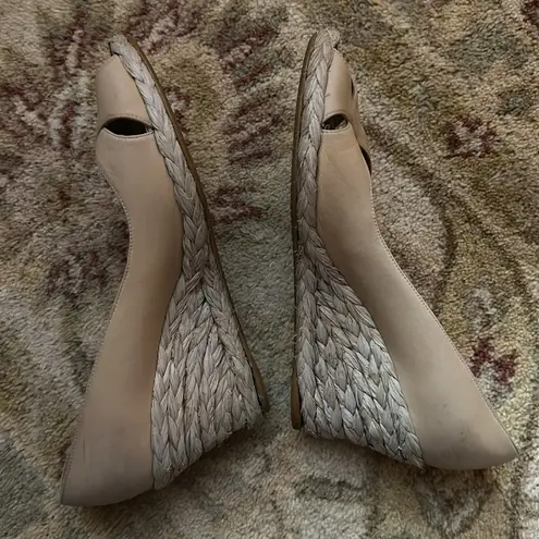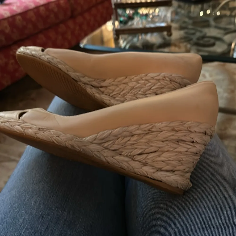 Stuart Weiztman Wedge Sandal Braided Straw Heel Detail Leather Upper Criss Cross Toe Detail Open Pee... Show more