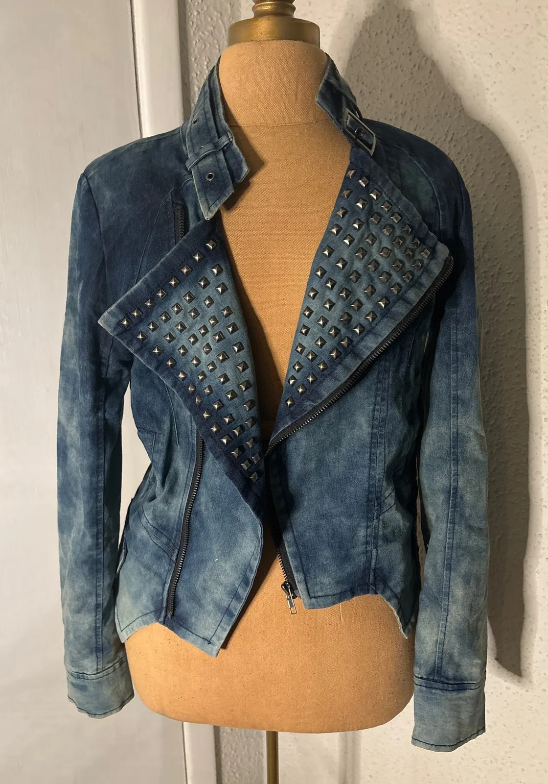 Style: Bleach wash, Studded Denim Moto Jacket, zip closure, padded shoulders Color: Blue/Silver Size... Show more