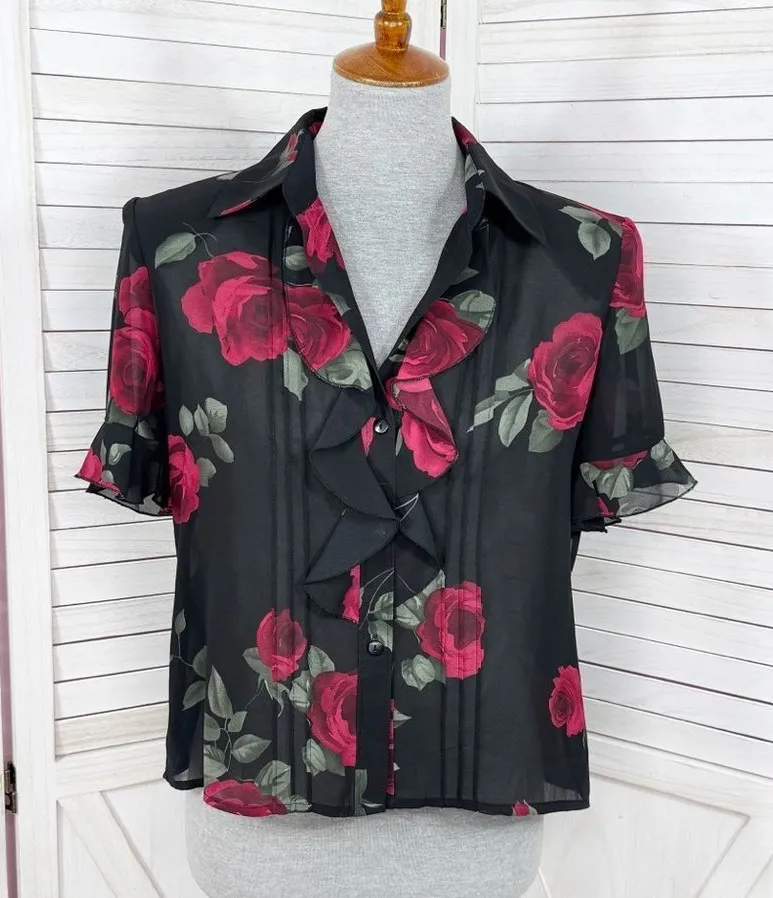 Studio I Sheer Ruffle Trim Roses Floral Crop Blouse Black Red Size 8 Black with large red roses Sheer chiffon fabric Stich pleats front Ruffle trim front Collared v neck Button front Short sleeves with ruffle cuffs Crop - sits at hips length Excellent preowned condition Armpit to armpit 20" Length shoulder to hem 22" Y2K Romantic Country Cottage Feminine Victorian Dark Coquette Gothic Layer Office Vamp Retro #618"