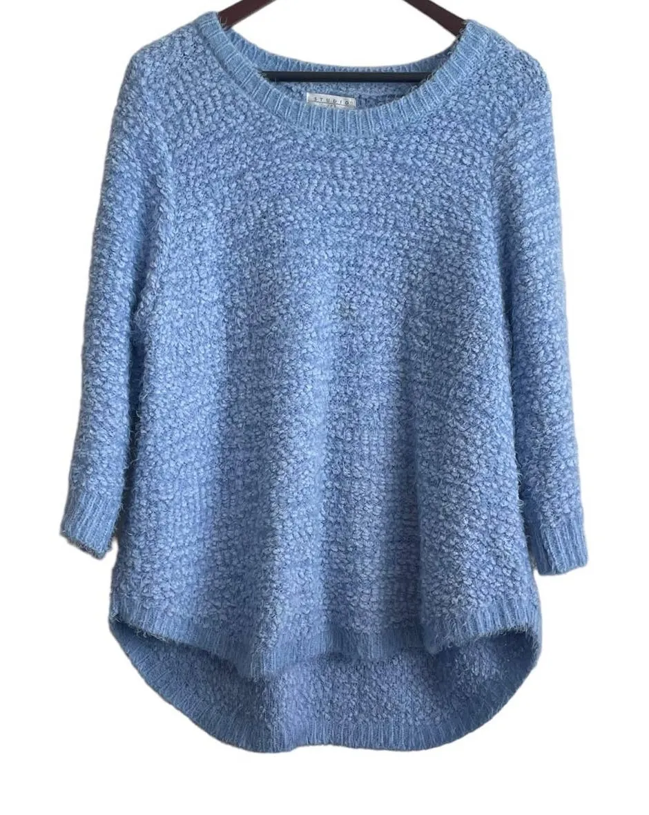 Studio JPR Sweater Women XL Blue Crew Neck 3/4 Sleeve Sherpa Fuzzy Cozy Casual Condition: preowned- great condition, no flaws Details: (First picture truest color) -high/low hem -powder, baby blue color -solid print -heavy weight -soft -some stretch -tight knit -straight silhouette -polyester acrylic blend, machine wash Approximate Measurements: flat lay: armpit to armpit: 22“ sleeve length: 19“ hemline: 24“ length: 26/28“ Pet/smoke free home 1-2 day shipping comfortable, easy care, packable, feminine, versatile, stylish, work, office, weekend, vacation, travel, fall, winter, warm, cozy
