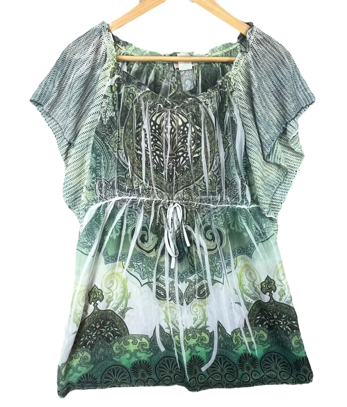 Serve major vintage vibes in this dreamy Studio MK sheer boho blouse. With its mandala print, cinched drawstring waist, and fluttery capped sleeves, this top is straight out of a late '90s/early 2000s closet. Pair it with low-rise jeans, a mini skirt, or layer it over a cami or bralette for that effortlessly cool Y2K look. Lightweight and flowy, it's giving festival fairy meets Delia's dream girl. • Size: Large • Made in USA • Material: 100% Polyester (Contrast: 100% Nylon) • Chest: 19" • Length: 29" • Sleeve Length: 6" • Pre-owned. No rips or stains. • Ships in 1–2 business days