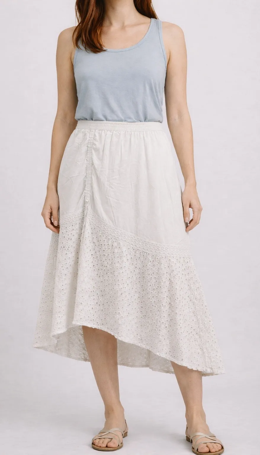 Features an elastic waistband and a drawstring detail at the front for adjustable comfort. The hemline is adorned with intricate eyelet lace and a delicate ruffle, creating a tiered, flowing silhouette. * Condition: Good pre-loved condition- small light stains seen on back of skirt (see photos) otherwise free of holes or tears * Size: XL * Color: White * Approx. Flat Measurements: Waist- 18", Length- 34" Digital model or mannequin photo may be used for styling purposes only. Keywords: Studio West skirt, white skirt, eyelet lace, boho skirt, festival skirt, ruffle skirt, tiered skirt, summer skirt, beach skirt, vacation skirt, casual skirt, plus size skirt, feminine, dainty