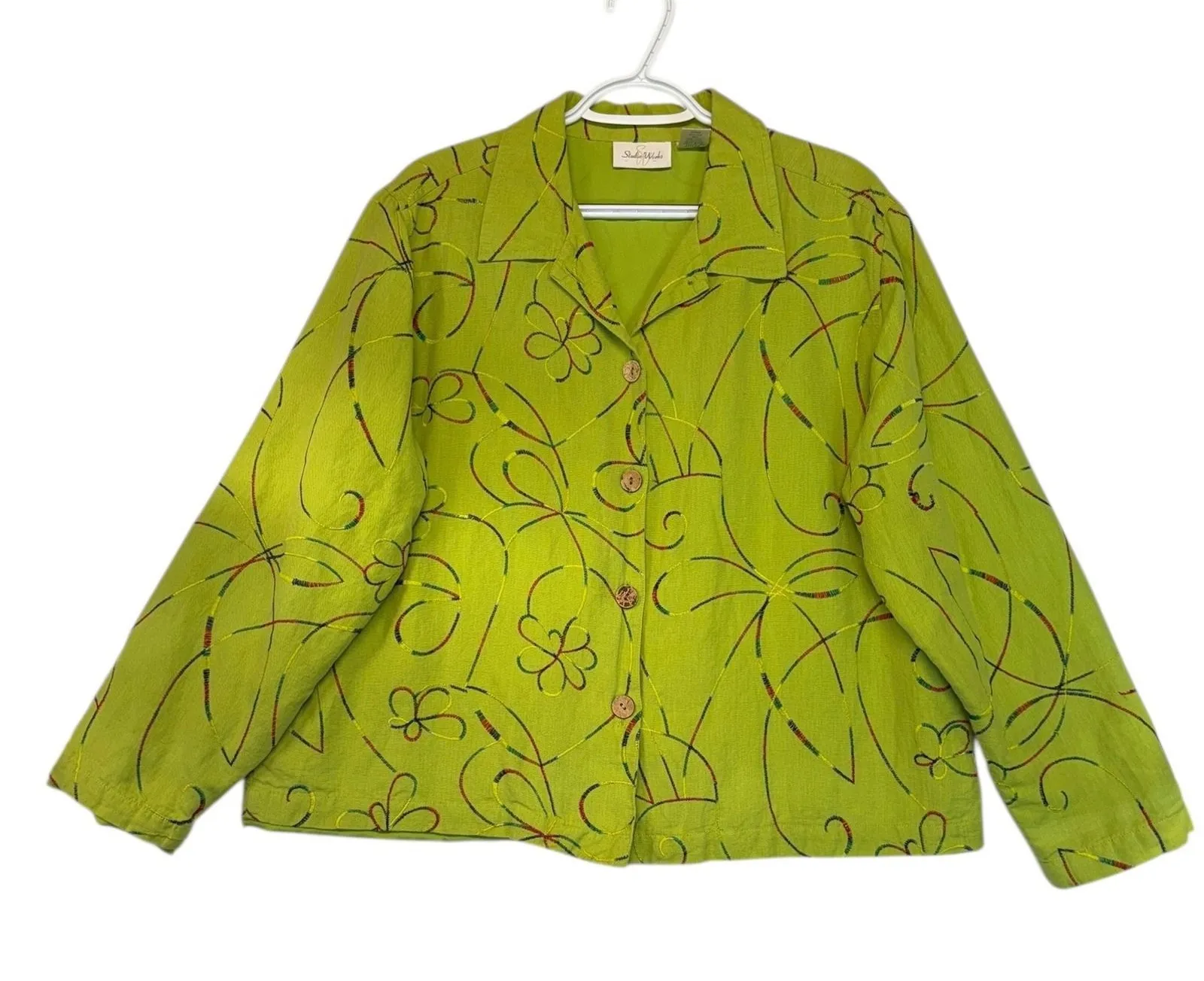 Brighten your wardrobe with this vibrant Studio Works button-up jacket top. Eye-catching embroidered floral motifs in shades of red, yellow, and blue dance across a cheerful lime green backdrop, adding a playful yet sophisticated touch. The relaxed silhouette and classic collar offer comfortable style, perfect for layering over your favorite basics. Elevate your look for a garden party, a casual brunch, or a creative workday. Measurements: • Chest (pit to pit): 23 in • Length: 23 in Type: Jacket Outer Shell Material: Linen Style: Basic Jacket Department: Women Lining Material: Polyester Theme: Nature, Flower Accents: Button, Embroidered Features: Collared, Lined Pattern: Floral Season: Spring, Summer, Fall Closure: Button Occasion: Casual Sleeve Length: Long Sleeve Fit: Relaxed Keywords: Studio Works, embroidered, floral, button up, jacket, top, lime green, vibrant, artistic, lightweight, spring, summer, casual, layering
