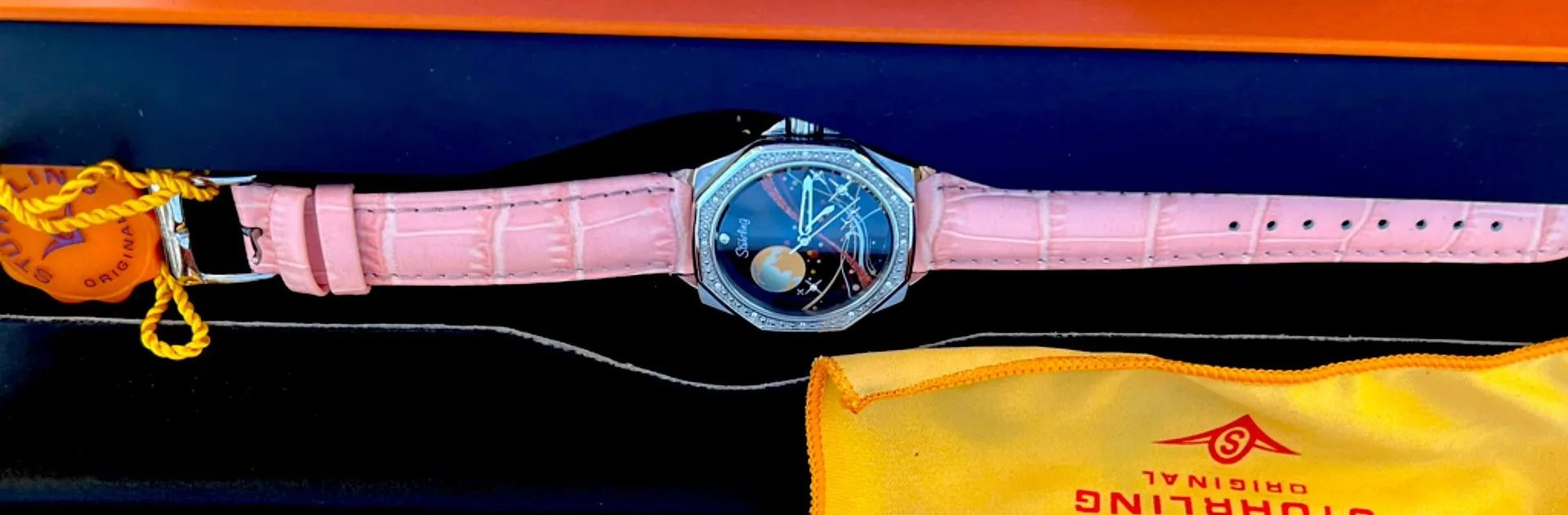 Authentic STUHRLING GALA SERIES 231d.11151 ROUND SILVER STAINLESS STEEL CASE & BEZEL WOMEN'S QUARTZ WATCH w/ LEATHER PINK STRAP IN ORIGINAL BOX W/ ALL ORIGINAL PAPERWORK & TAGS. An ANALOG WATCH that's WATER RESISTANT UP TO 165 feet or 50 meters! Has an ATTRACTIVE OCTAGON DIAL. Never worn. Has a SIZE 18 MM EMBOSSED WRISTBAND. Has a COOL ATOMIC SPACE AGE MOTIF on FACE w/ STARS, MOON, SATELLITES, & SPARKLY GOLD SPACE DUST TRAIL FROM A PASSING COMET. Has a few SWAROVSKI CRYSTALS around DIAL & on the face as well. The leather smells so good!! Those of you who are ACCUSTOMED TO THE BEST & LIKE TO ADORN YOURSELF w/ LUXURY WHEN IT COMES TO WATCHES ARE ALREADY FAMILIAR w/ STUHRLING'S REPUTATION DATING BACK TO THE 1800's OF SWISS PRECISION. Please ask ? before buying & see all photos. Retails at $250+, YET BEING OFFERED AT A FRACTION OF THAT! WOULD MAKE GREAT GIFT FOR THAT SPECIAL LADY IN YOUR LIFE!! Thank you for looking!