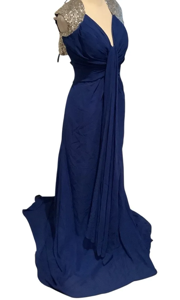Elevate your style with this chic navy maxi dress, featuring elegant silver detailing on the shoulders, train hem, sexy low back. Front tie fabric can double as an over shoulder shawl. Perfect for any special occasion. BRAND NEW NEVER WORN