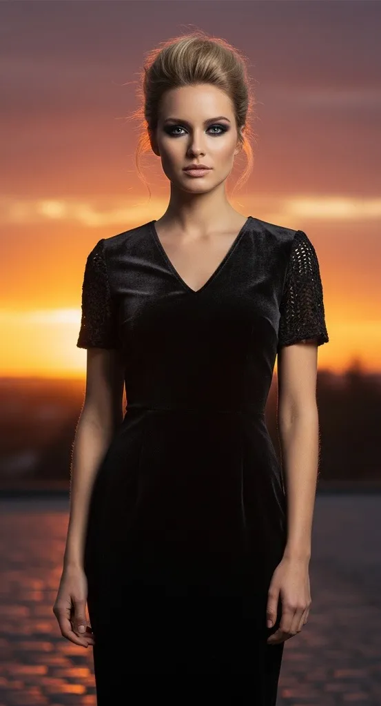 distress is so incredibly gorgeous that pictures just don’t do it justice. It’s got a beautiful deep V-neck a straight bodice with a high slit in the back beautiful sequin sleeves and a zip back. The dress is in excellent vintage condition has been recently dry, cleaned absolutely stunning. Length: 58” Waist: 15” Pit to pit: 16” Sleeve length: 8” Shoulder: 6” Deep v: 11” Back kick slit: 23” See actual dress virtual model is showing a version that varies Velvet Not a lot of stretch but can be tailored to the body easily Beautiful sequin sleeve Rich black velvet color Sexy back kick slit for comfort and ease A vintage classic stunner