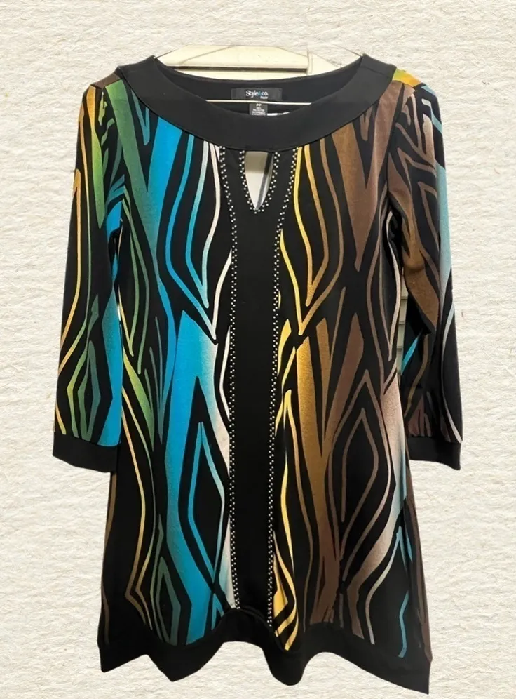 Beautiful excellent condition abstract animal pattern tunic shirt. Material is polyester and spandex... Show more