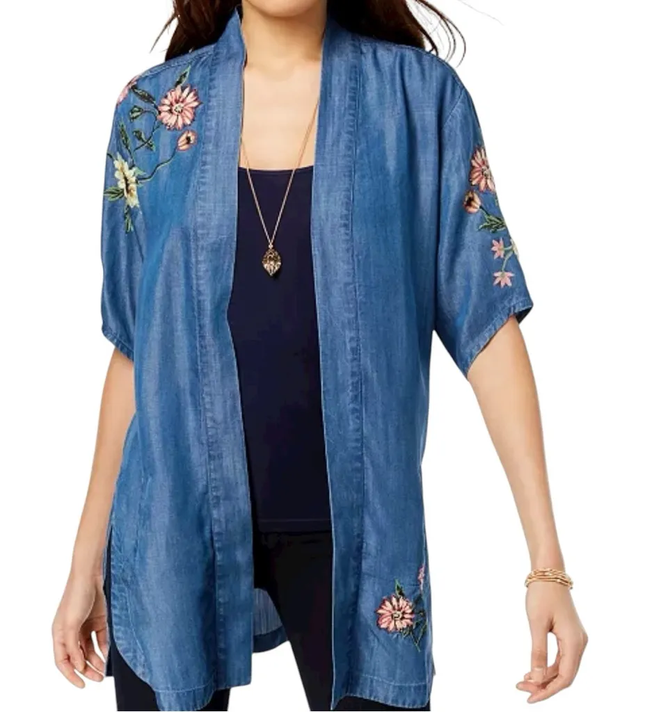 Collarless; open front Vent at sides Hits below hip Floral embroidered Adjustable drawstring in the... Show more