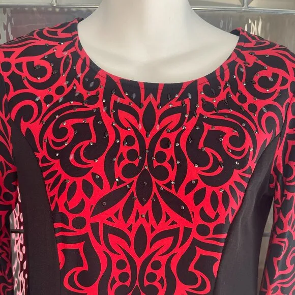 Like new fresh from the dry cleaners stored at a pet free and smoke-free home This Style & Co shirt is a geometric-pattern tunic blouse with 3/4 sleeves and a crew neck. It features a studded body contour design in a red and black multicolor palette. Made from a polyester spandex blend knit, this slim-fit blouse is perfect for various occasions such as travel, weddings, parties, casual wear, or work. It is a petite size PP and suitable for all seasons.