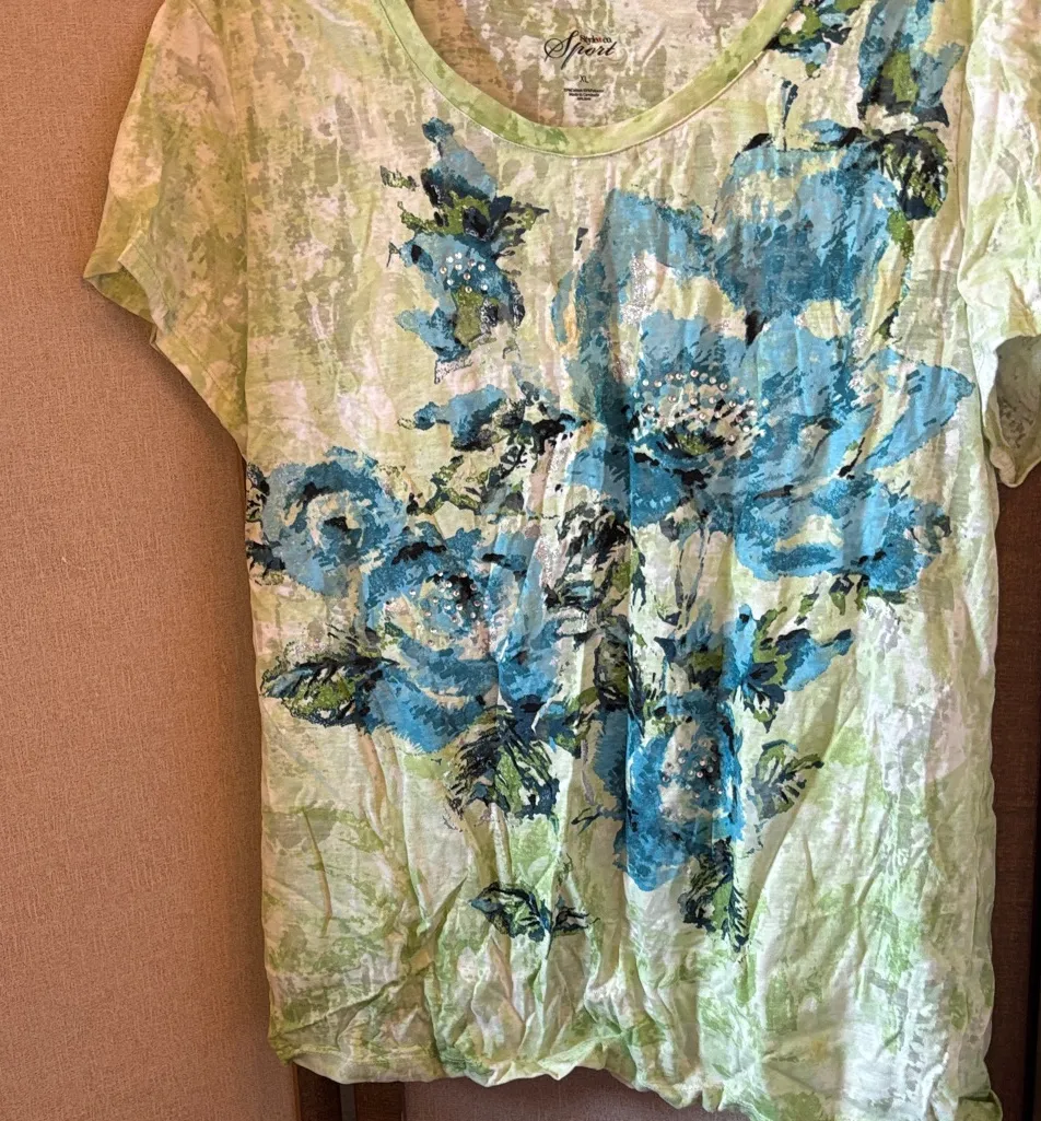 Chic top with vibrant blue floral design. Soft green background. Perfect for casual wear. FAR1222