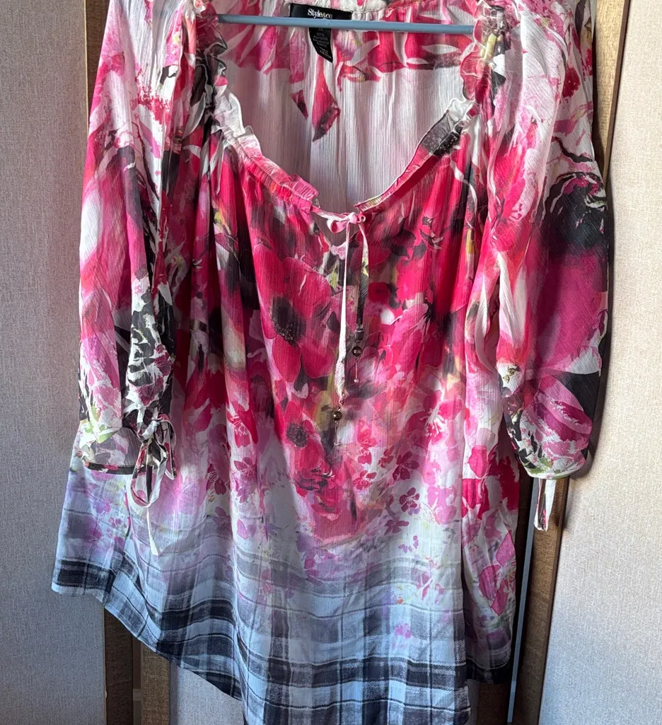 Chic floral blouse with vibrant pink hues. Features a relaxed fit and tie details. Ideal for casual... Show more