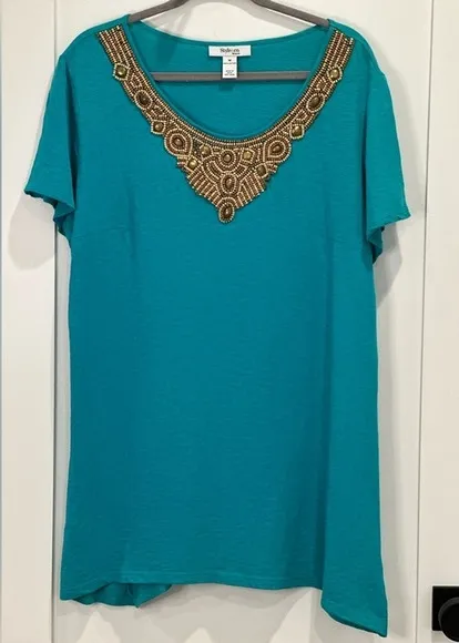 Style & Co Turquoise T-Shirt With Wood Beaded Neckline Detail New without tags! The extra beads bag... Show more