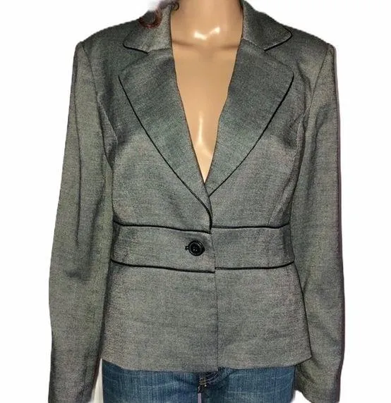 Black tweed. Soft and stretchy. One button closure. built in shoulder pads. 20” pit to pit x 22” lon... Show more