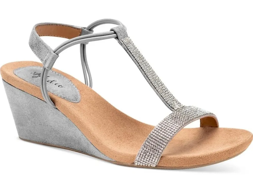 Brand new in box! Style & Co Gray Metallic/Tan 'Mulan' wedge sandals with sparkling silver rhineston... Show more