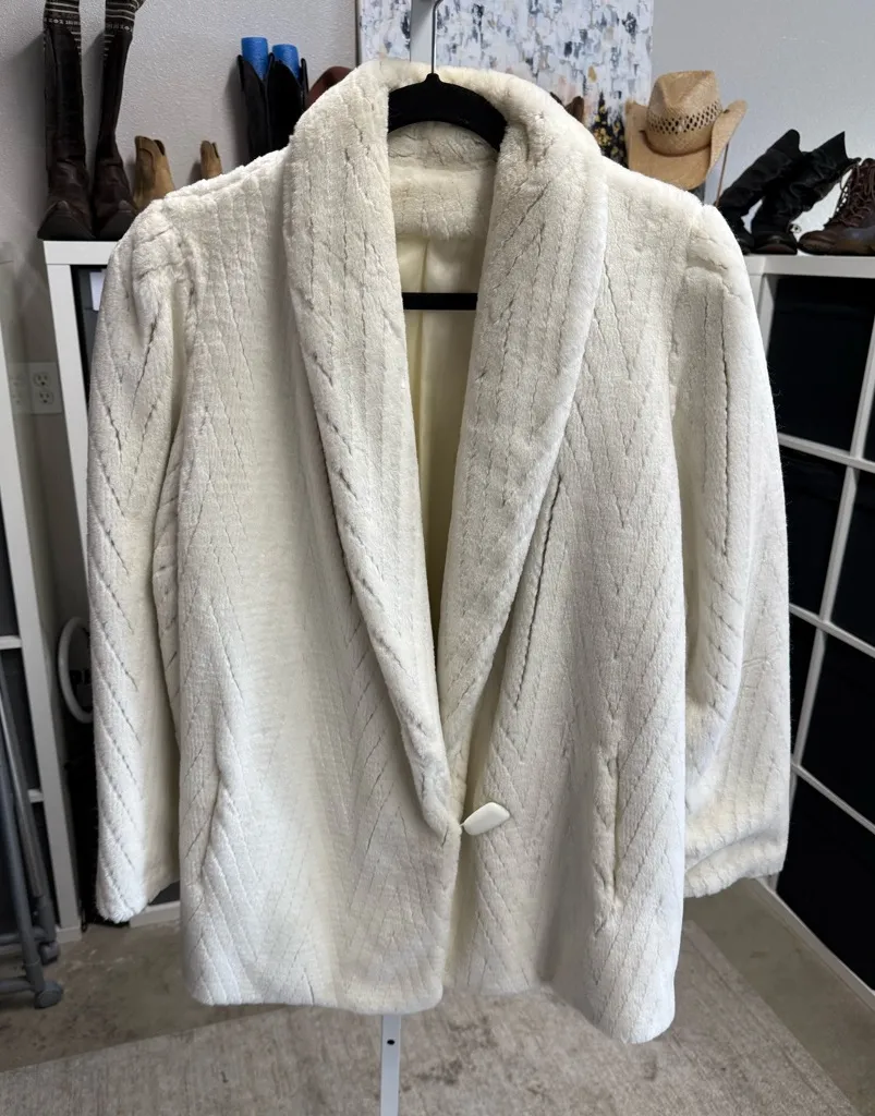 **Please note: Poshmark recently transitioned to Ground shipping rather than Priority, so sadly shipping times are slower—order accordingly!** Stay warm and stylish with this elegant white coat. Perfect for any occasion. Very Cruella DeVil-esque. Size unknown and estimated, please double check measurements. Pit to pit: 21” Length: 29” Colors: white off white cream grey gray Fabric: unknown Item or RN #: unknown Please view photos, video, and description carefully and check for any flaws. Measurements are approximate, check closely and be sure to ask if you’d like additional measurements. I video and photograph while packing for shipping to protect myself and the buyer. Vintage, old, antique, mcm, 70s, 80s, 90s, movie costuming, old-timey, wardrobe staple.