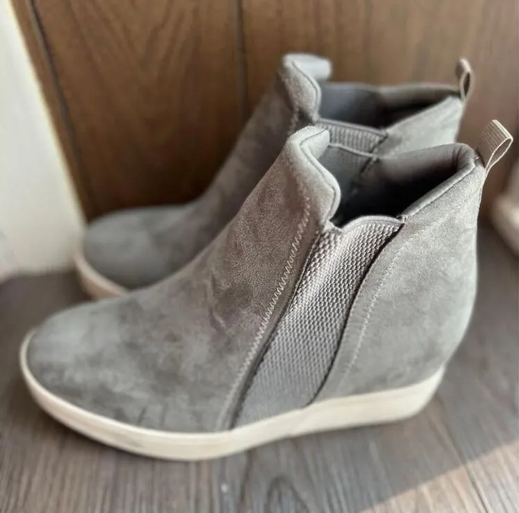 Chic and comfortable wedge sneaker boots in soft gray suede with elastic mesh side panels for easy s... Show more