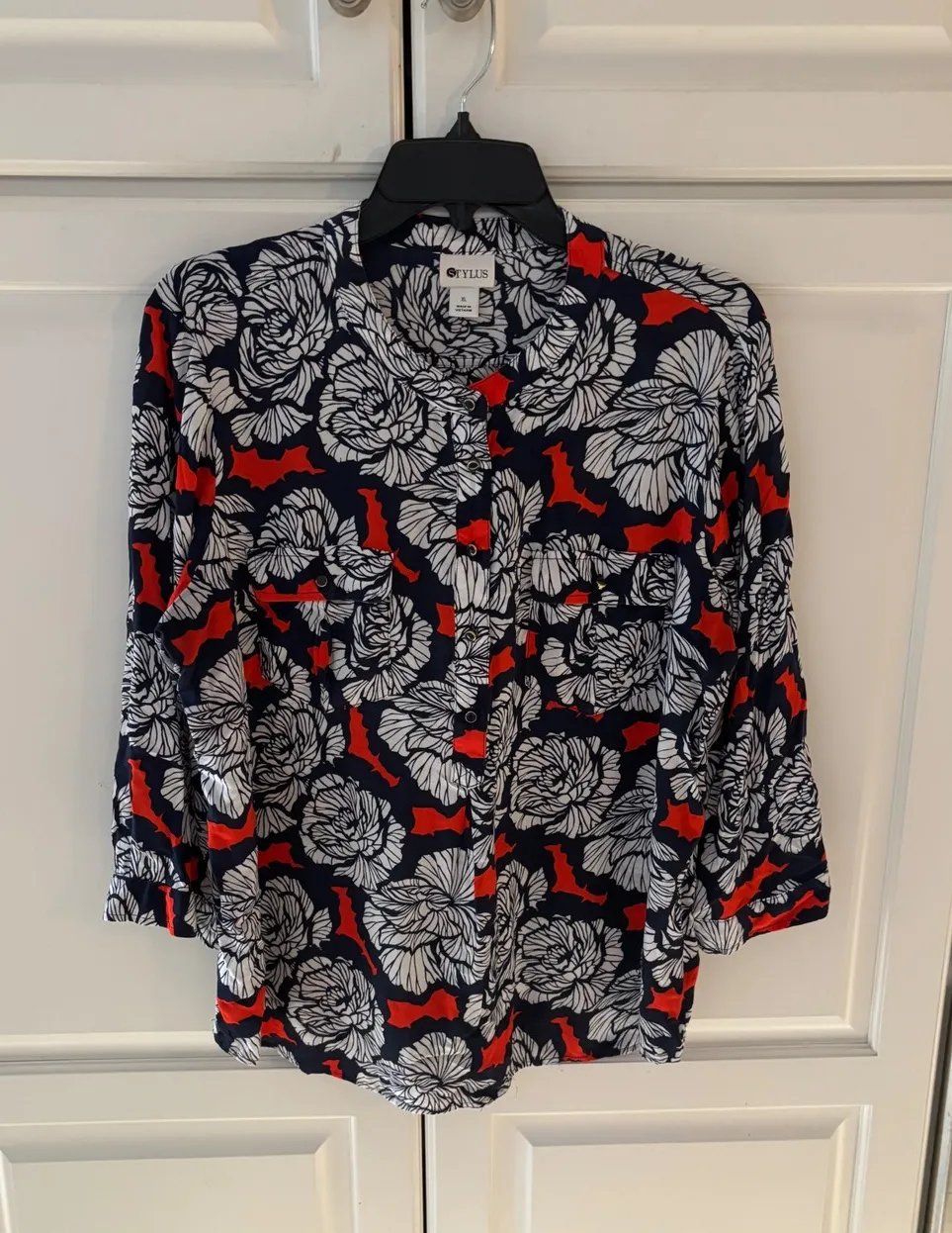 Embrace vibrant style with this eye-catching button-up shirt, adorned with a captivating navy, white, and red floral print that bursts with energy. The playful yet sophisticated pattern, accented by subtle red details, creates a dynamic visual appeal that's sure to turn heads. Crafted from a comfortable and breathable fabric, this top offers a relaxed yet polished look, perfect for your everyday adventures. The classic button-up design and versatile 3/4 sleeves make it an ideal choice for a casual brunch with friends, a productive day at the office, or a relaxed weekend getaway. Length 26" pit to pit 21" Type: Button-Up Department: Women Material: Rayon Neckline: Collared Sleeve Length: 3/4 Sleeve Sleeve Type: Casual Sleeve Pattern: Floral Accents: Button Theme: Nature, Colorful Features: Pockets, Breathable, Lightweight Fit: Relaxed Keywords: STYLUS shirt, women's floral shirt, navy red white floral, button up blouse, 3/4 sleeve top, plus size blouse, casual shirt, work blouse, summer top, spring fashion, boho print, designer shirt, rayon blouse, vibrant print, stylish top