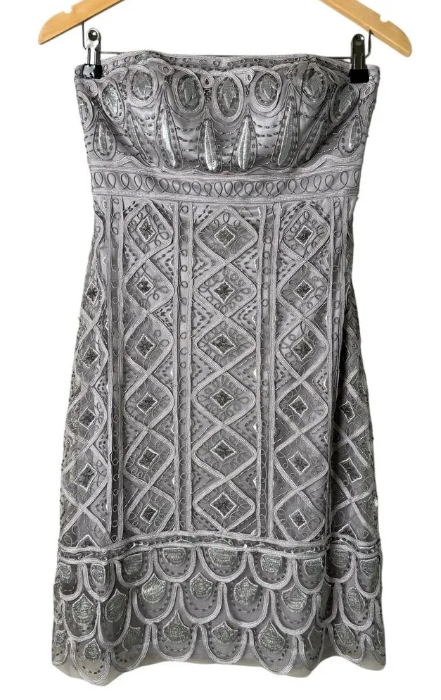 Sue Wong Beaded Embroidered Strapless Embellished Mini Dress in Silver Gray, Size 4 Features: strapless neckline, fitted waist, mini hem, fully lined, embellished overlay with intricate embroidery and beaded details. Color: silver gray. Approx. Flat Measurements: Bust (P2P): 15" Waist: 14" Hip: 17" Length (armpit to hem): 31" Style: retro 1920s vibes, cocktail, wedding guest, bride, bridal shower, bachelorette party, evening wear, chic, elegant, minimalist, classic, classy • Excellent preowned condition • Smoke & pet-free environment • Next-day shipping • Accepting Offers #T2S1b0515