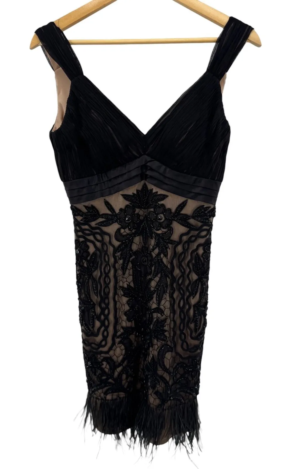 Gorgeous Sue Wong Nocturne cocktail dress featuring intricate hand-beaded floral mesh over a nude illusion lining, creating a dramatic black-on-nude contrast. The bodice has pleated wide straps and a satin empire waist detail for a sculpted, flattering silhouette. The skirt is fully embellished with jet beads, sequins, and embroidery, finished with a luxe 100% ostrich feather hem for movement and vintage glamour. Perfect for evening events, holiday parties, Art Deco–inspired looks, Gatsby themes, or formal occasions. Details • Brand: Sue Wong Nocturne • Size: 0 • Color: Black / Nude Illusion • Length: 34" • Pit to Pit: 17" • Materials: • Self: 60% Nylon, 40% Polyester • Trim: 100% Ostrich Feathers • Lining: 100% Polyester • Care: Spot clean only • Closure: Back zip • Features: • Fully beaded floral mesh overlay • Jet bead and sequin embellishment • Ostrich feather trim hem • Pleated wide straps • Nude illusion base • Figure-flattering empire waist Condition: Excellent pre-owned condition. sue wong feather dress, beaded mesh cocktail dress, gatsby vintage dress, art deco beaded dress, black nude illusion dress, formal evening dress, ostrich feather hem, embellished dress, sue wong nocturne size 0