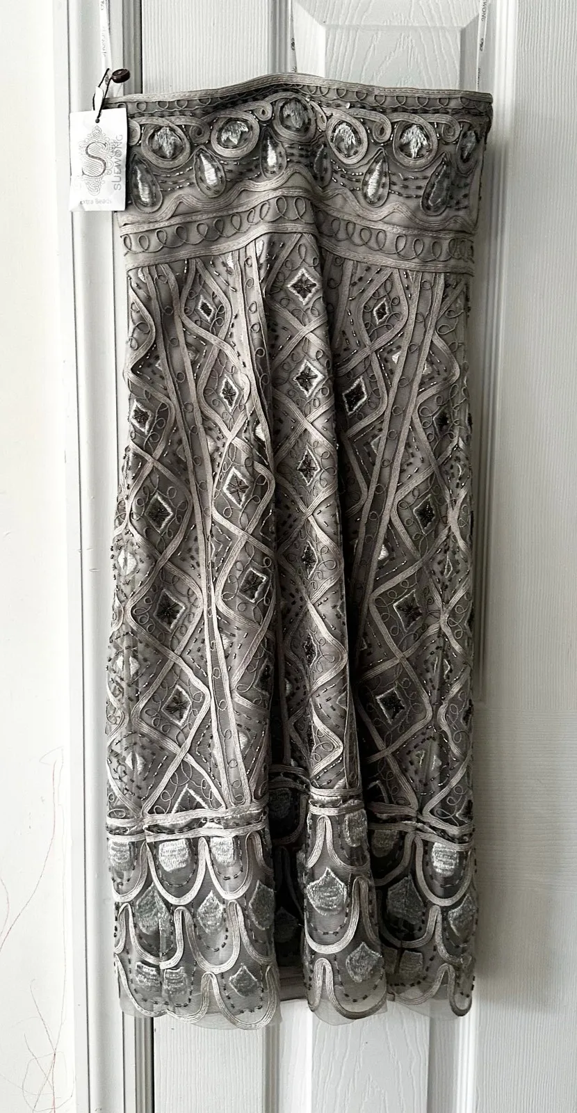 Size 2 from Sue Wong Nocturne. New with tags. Vintage deadstock. Silver satin heavily beaded geometr... Show more
