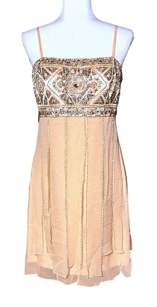 Sue Wong Nocturne VTG Y2K Beaded Silk Mini Dress Fairycore Flapper 10 Whimsygoth Hidden side zipper closure. Lined bust and skirt. Adjustable straps (marks on straps from metal adjuster) One mark on side of dress near zipper- see pictures Marks on silk flaps from bead transfer - see pictures All beads intact. Stunning!!! Light pink color Length 30” Pit to pit 17.5”