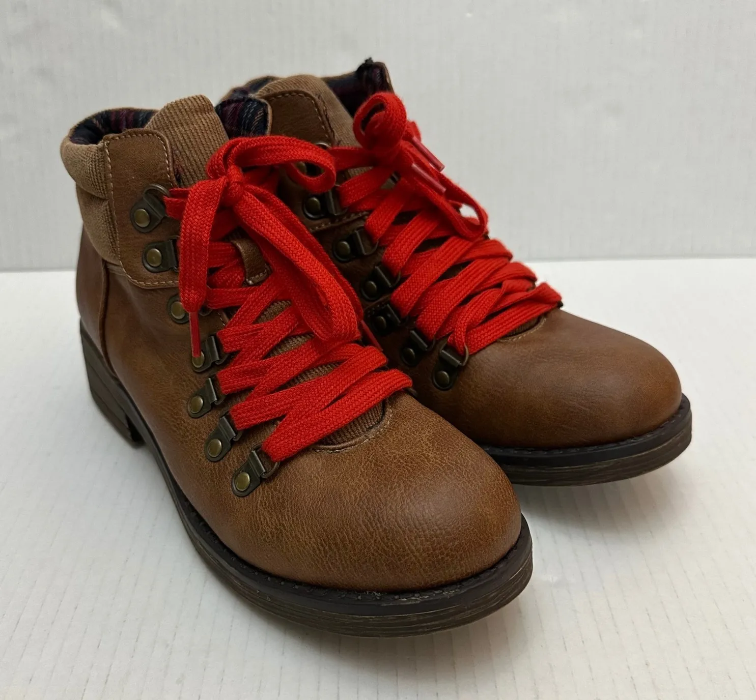 Rustic charm meets modern style in these Sugar ankle boots. Imagine the crisp air and vibrant colors of autumn as you lace up these beauties, ready for a day of apple picking or a casual stroll through the park. The rich brown faux leather is complemented by eye-catching red laces, while the plaid lining adds a touch of cozy sophistication. Details like the corduroy trim and bronze-tone eyelets elevate the overall look, making these boots perfect for weekend adventures, pumpkin patch visits, or adding a touch of rugged flair to your everyday style. Smoke free, dog friendly home. O235F28B00 Style: Bootie Department: Women Upper Material: Faux Leather Theme: Cowboy, Hunting, Western, Autumn, Fall Shoe Shaft Style: Ankle Heel Style: Block Occasion: Casual, Travel Lining Material: Fabric Insole Material: Fabric Outsole Material: Rubber Toe Shape: Round Toe Heel Height: Low (1-1.9 in) Type: Boot Keywords: Sugar boots, ankle boots, brown boots, faux leather boots, red laces, plaid lining, women's boots, casual boots, fall fashion, autumn style, corduroy trim, hiking inspired boots, women's footwear, boots with red laces