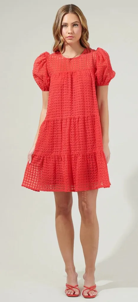 Chic and playful mini dress. Features a vibrant red hue. Textured fabric adds unique flair. Perfect... Show more