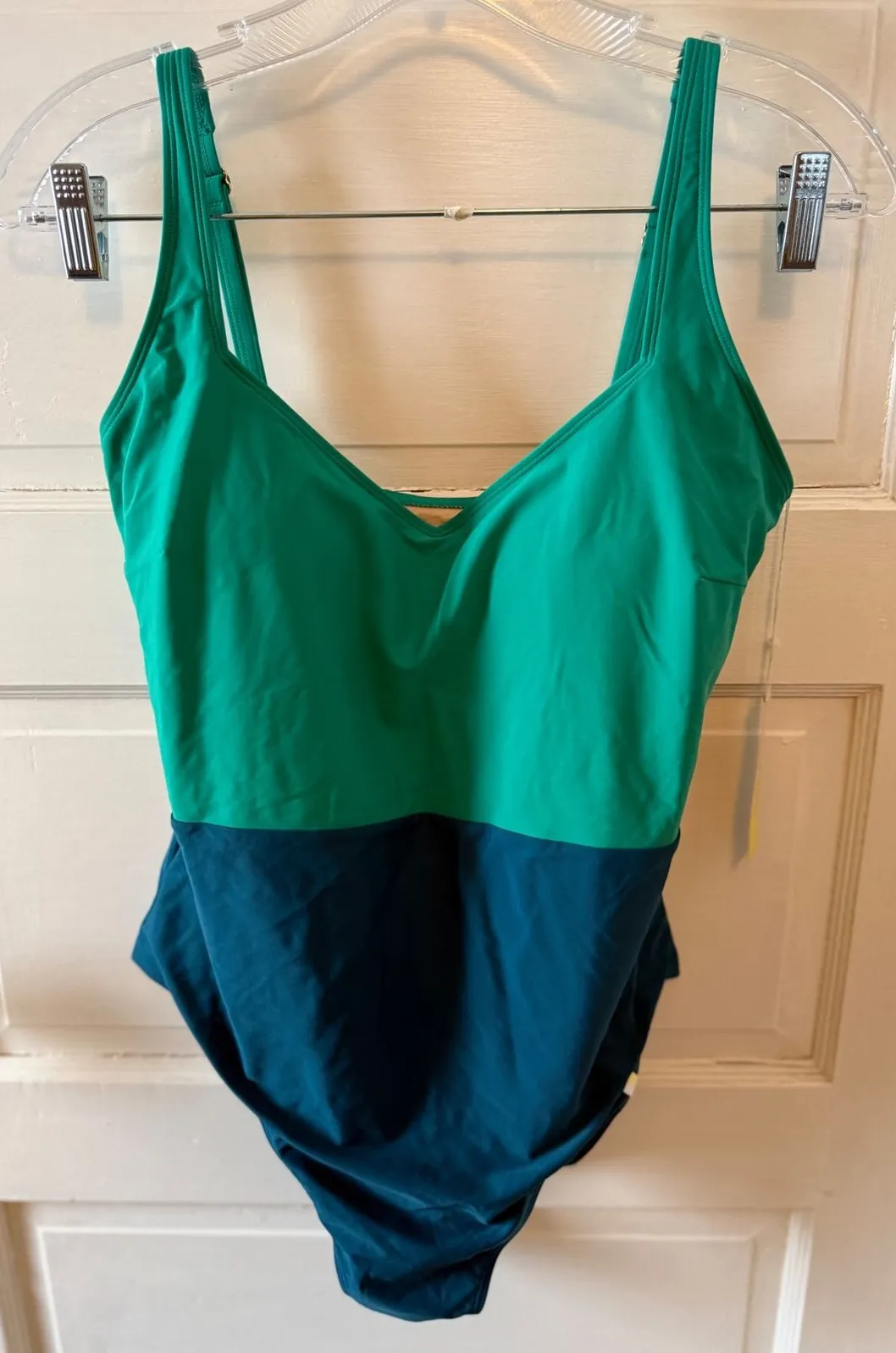 Dive into summer style with this striking Summerslt one-piece swimsuit. The flattering V-neckline and chic color-block design in vibrant teal and deep green create a sophisticated silhouette. Adjustable straps ensure a perfect fit, offering both comfort and confidence as you soak up the sun. Ideal for a beach vacation, poolside lounging, or a resort getaway. New with tags Size 12 Keywords: Summerslt swimsuit, color block, teal swimsuit, green swimsuit, v neck one piece, adjustable straps, beachwear, poolside, vacation, resort wear, swimsuit size 12, athletic swimsuit, chic swimwear