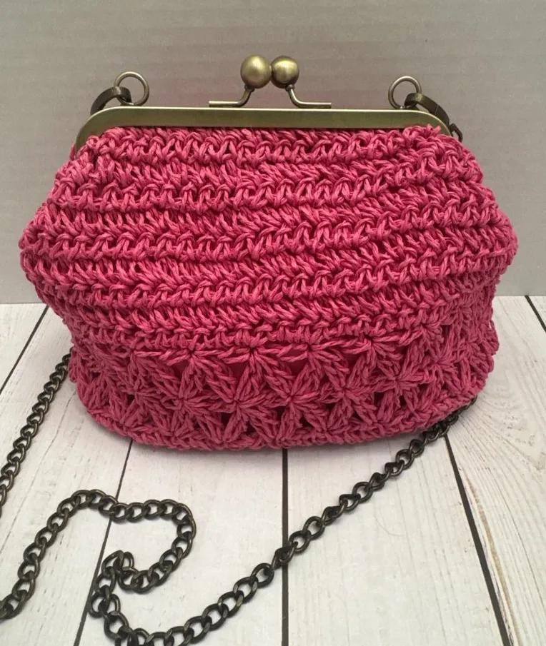 This Sun ‘N’ Sand Hot Pink Kisslock Woven Shoulder Bag/Purse is in very good condition and has a crochet type material with a gunmetal like chain strap. Could be used as a crossbody but it sits a bit high above the waist (at least for me). Kisslock closure and inside pocket.