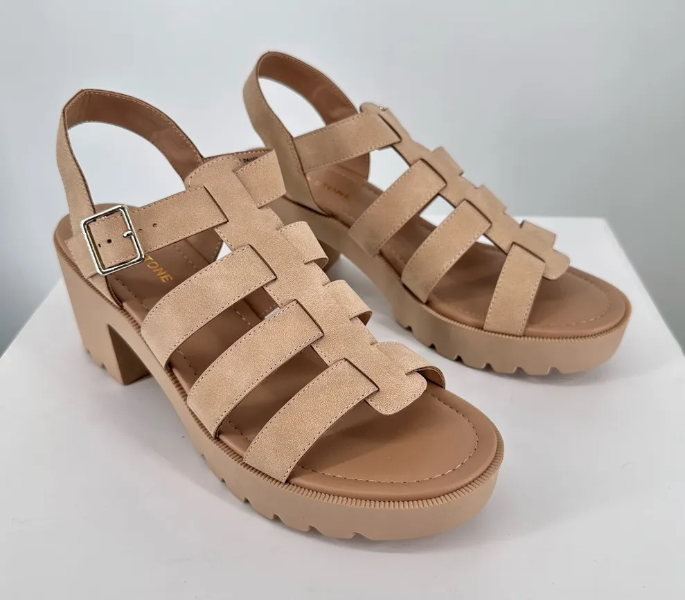 A faux leather fisherman sandal look gets a sporty boost on the chunky platform of Sun + Stone's Daisee sandals. 2-1/2" block heel; 1 platform Round-toe T-strap slingback platform sandals with adjustable buckle closure Manmade upper; manmade lining; rubber sole No flaws, new in box.